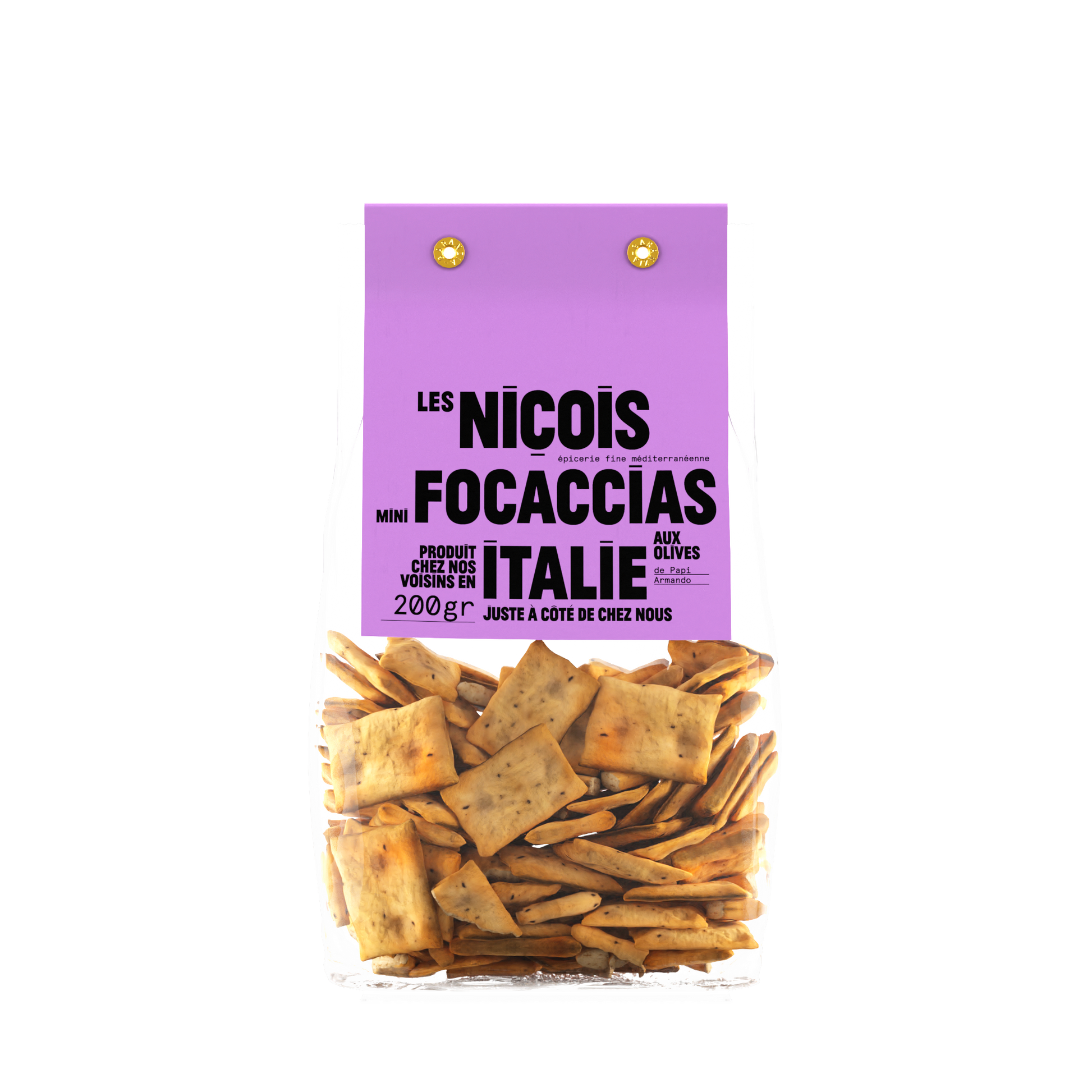 Chez Les Niçois, la focaccia est en version miniature, bien cuite, très croustillante. On les a préparées avec des morceaux d’olives noires pour être dégustées telles quelles ou en toast avec nos tartinables.